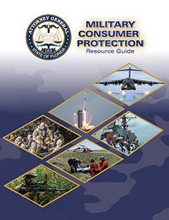 The state of Florida is home to more than 90,000 active and reserve members of the Armed Forces and more than 1.5 million veterans. Unfortunately, these military members and their families are not immune to the deceptive practices and scams of unscrupulous businesses and individuals. This guide offers information on predatory lending practices, identity theft, debt collection, foreclosure fraud and much more in an effort to help keep military members and their families safe from these unfair and deceptive practices. Download the Military Consumer Protection Guide in its entirety or click a topic below to view only a particular section.